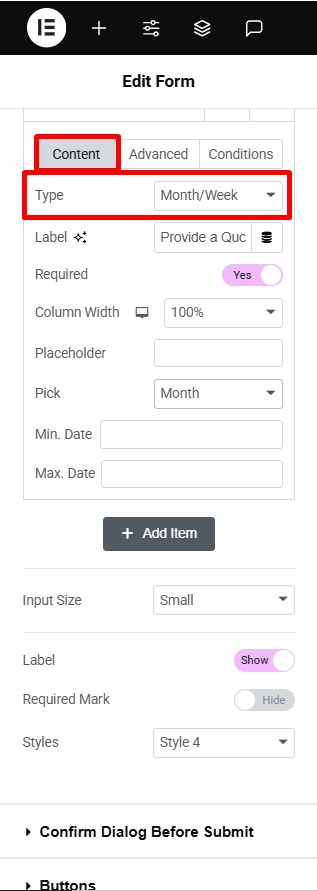 - Navigate to the Content section of your Form Field. From the Field Type dropdown, select the month/week Field.