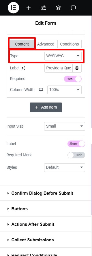 - Navigate to the Content section of your Form Field. From the Field Type dropdown, select Add WYSIWYG Field.