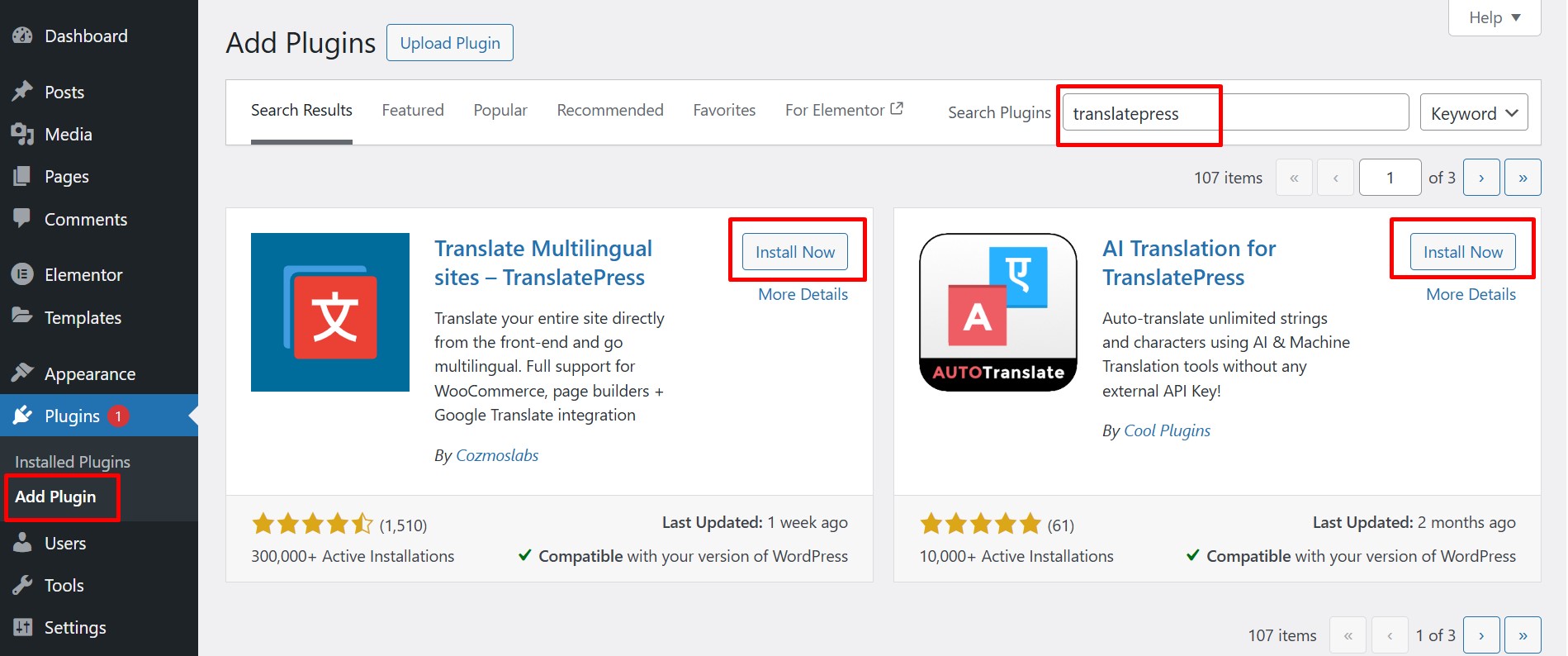 - Search for the “TranslatePress” plugin.