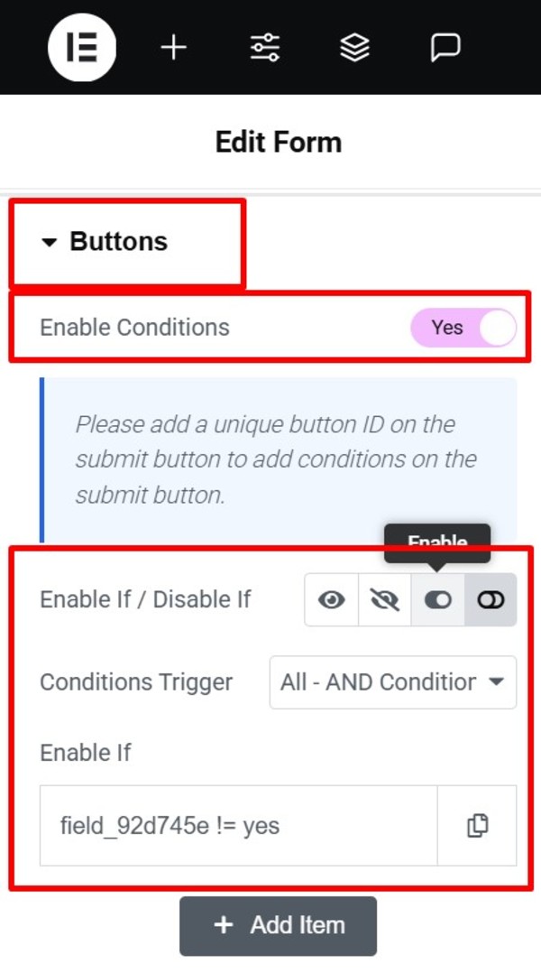 - Toggle the switch “Enable Conditions” to Yes. This will activate conditional options for the submit button.