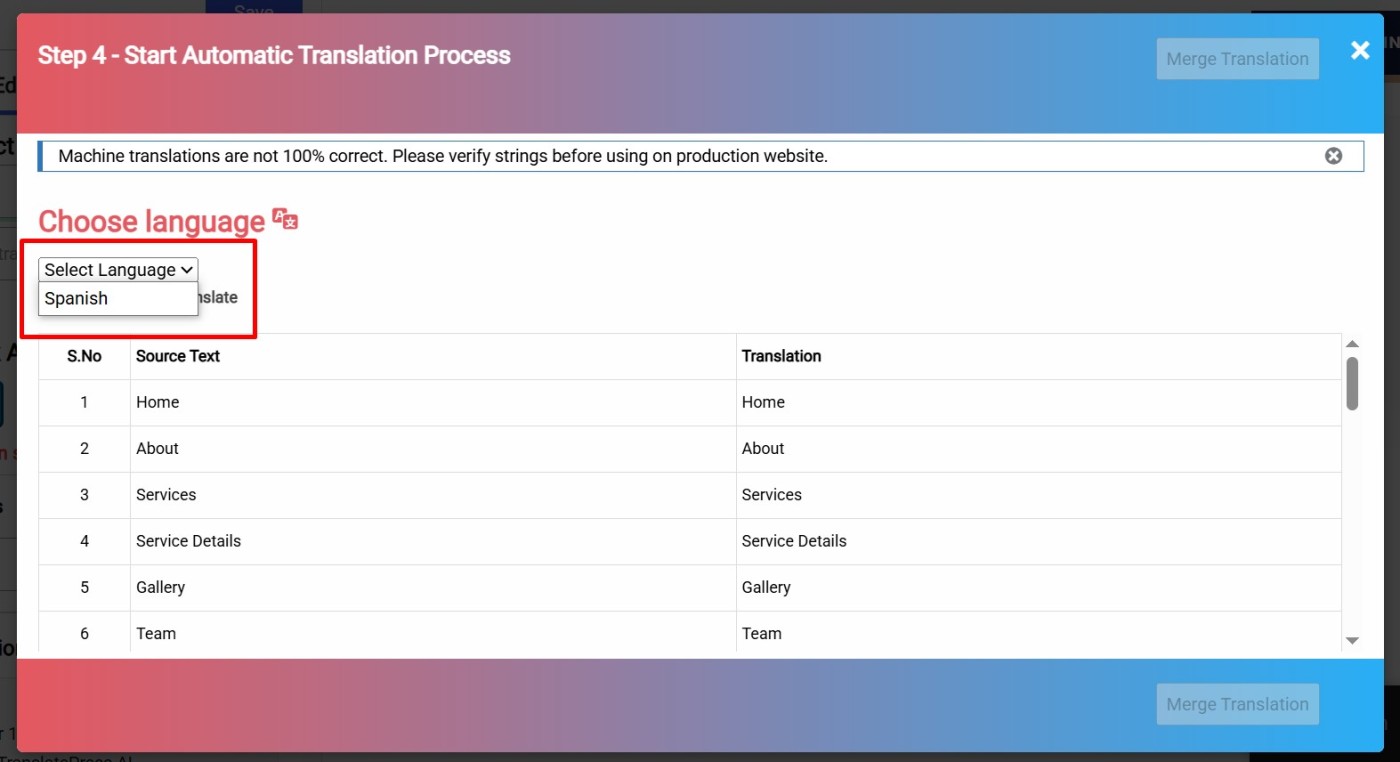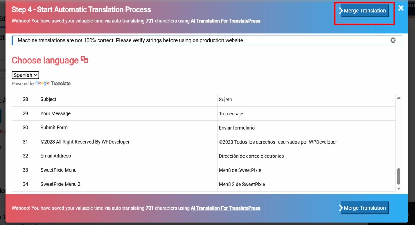 If you’re using AI Translation for TranslatePress, you can enable the Google Translate widget to automatically translate your webpage content within a few minutes.