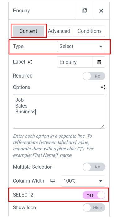 - Toggle the “SELECT2” switch to Yes if you want a searchable dropdown.