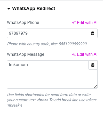 - WhatsApp Phone: Enter your phone number with country code, this is the number that users will be redirected to when they submit the form.