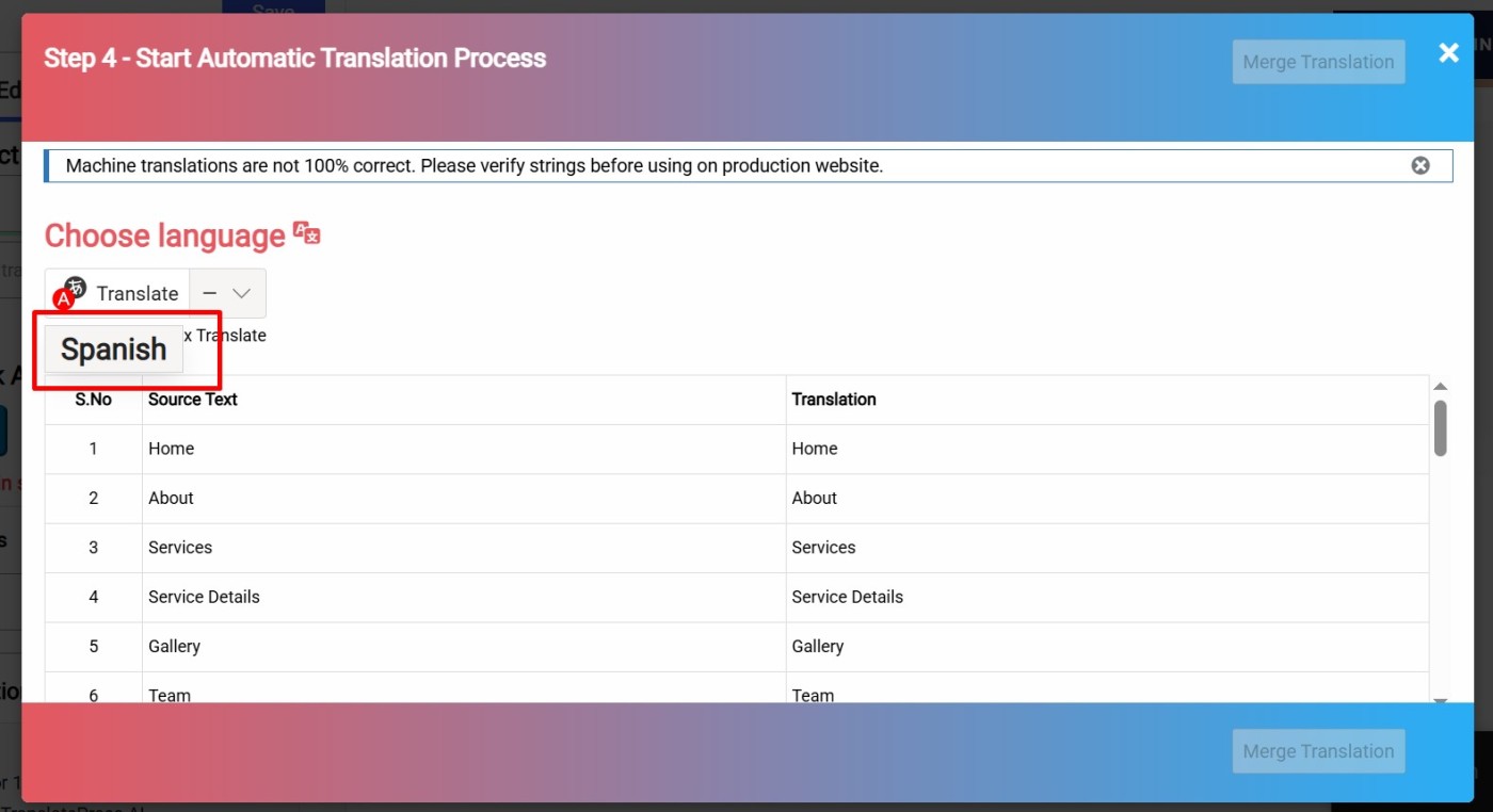 - Después de seleccionar el idioma de destino, el botón de Traducción Automática se habilitará.