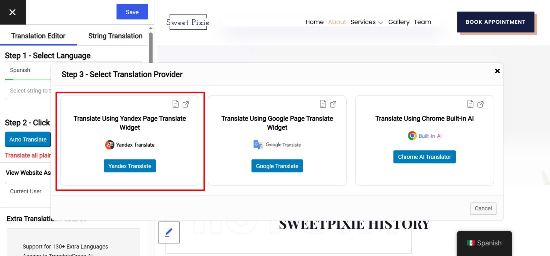 Si estás utilizando AI Translation for TranslatePress para traducir automáticamente tus páginas web, puedes habilitar el Widget de Traducción de Yandex para obtener resultados de traducción más rápidos.